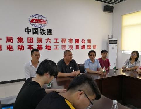 接着来到“中国-东盟新能源电动车基地建设项目部”,企业总经理张永超、何涛、土木工程学院傅少君院长以及三位指导老师在项目部会议室进行了详细实习工作部署。张永超总经理首先对工程情况进行了详细介绍,并就相关的安全问题对学生提出了几点要求;傅少君院长从安全、专业知识理论实践、感恩和礼仪等各个方面对学生提出了实习具体要求;实习指导老师结合工程项目安排和学生学习兴趣将学生划分为测量、广联达、BIM、识图和材料5个小组,并明确各个小组的指导教师和组长。在此基础上,对本次实习进行了详尽的规划,并根据企业的工程情况编制了极具针对性的中铁二十局特有实习大纲。