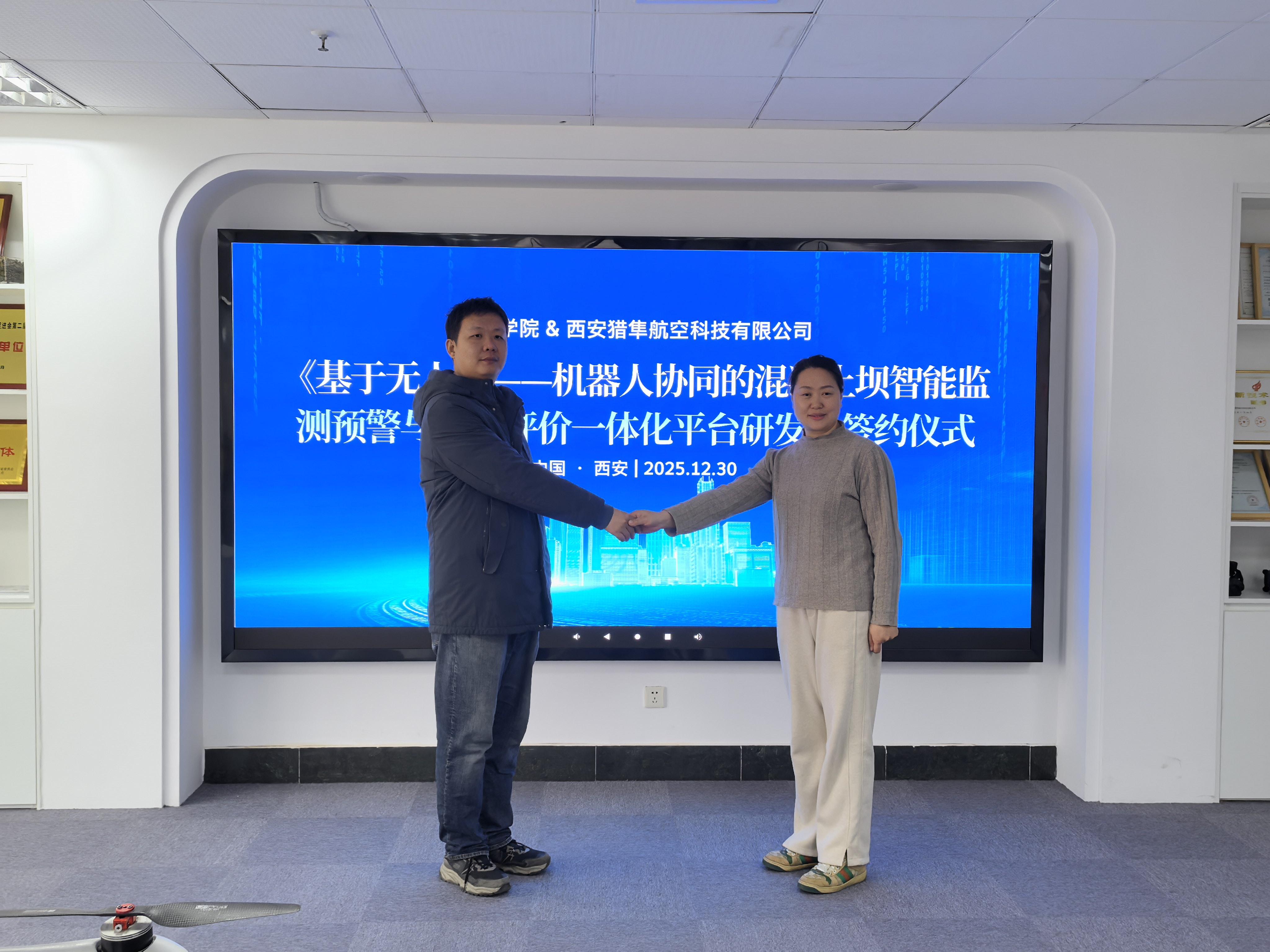 近日,土木工程学院与西安猎隼航空科技有限公司就“基于无人机-机器人协同的混凝土坝智能监测预警与安全评价一体化平台研发”项目举行了签约仪式。土木工程学院项目负责人张耀老师和西安猎隼航空科技有限公司法人马晓青出席签约仪式。
